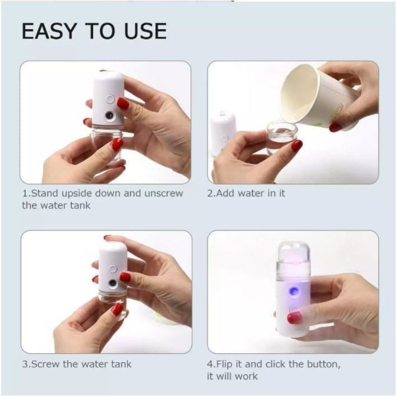 Bahan : ABS Kapasitas Air: 30ml Kapasitas Baterai: 450 mAh Pengisian: USB Charger Warna: Putih, Hitam, Pink, Biru, Kuning, Hijau Berat produk: 75g ukuran tunggal: 4 * 4 * 14.5 Bisa diisi dengan air mineral, toner wajah, disinfektan dan alkohol sesuai dengan keperluan.