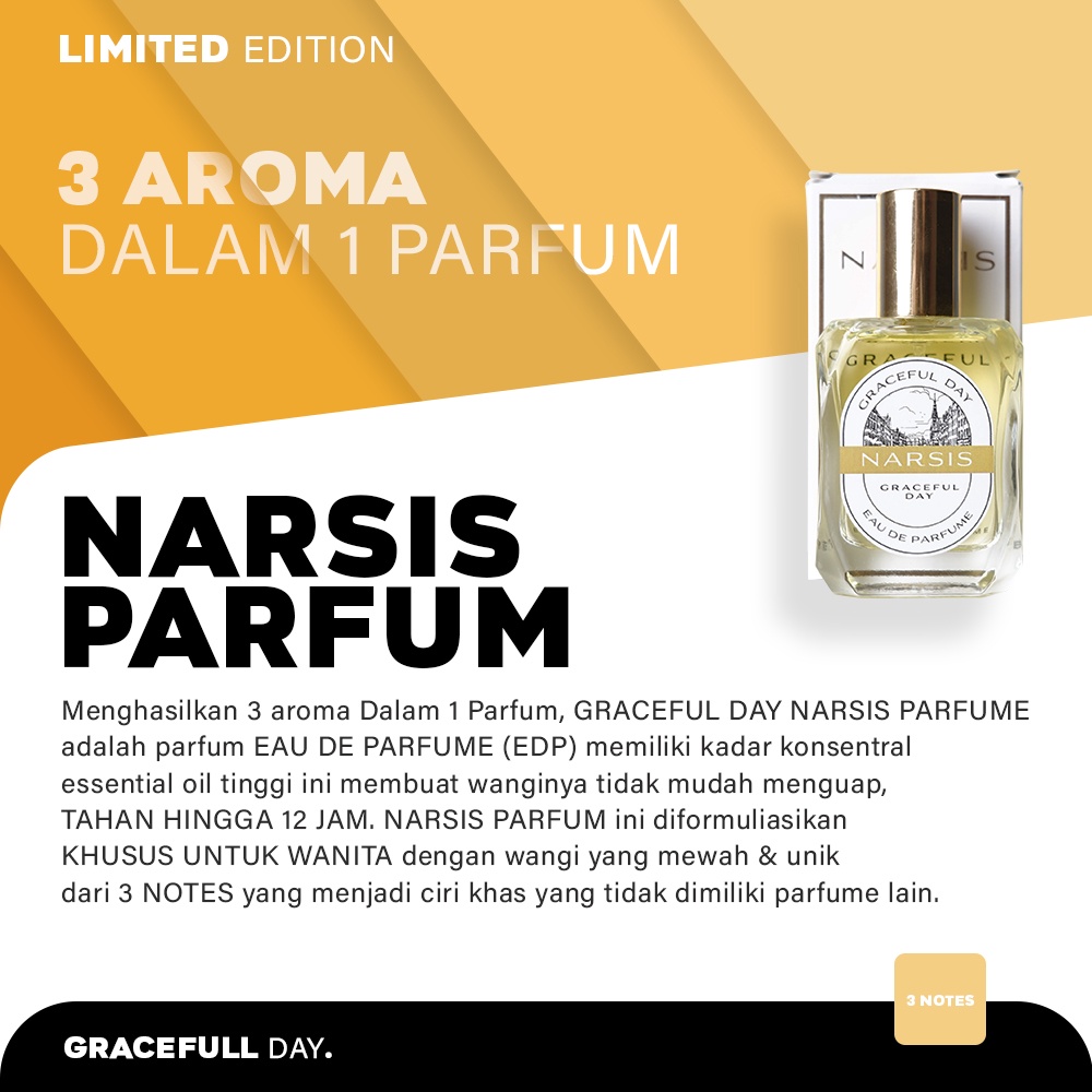 NARSIS Graceful Day termasuk dalam jenis parfum Eau de Perfume (EDP) yang memiliki konsentrasi keharuman tinggi, aromanya lembut, didominasi oleh keharuman jasmine dan vanila yang tahan lama dan tentunya sangat cocok digunakan untuk sehari-hari.