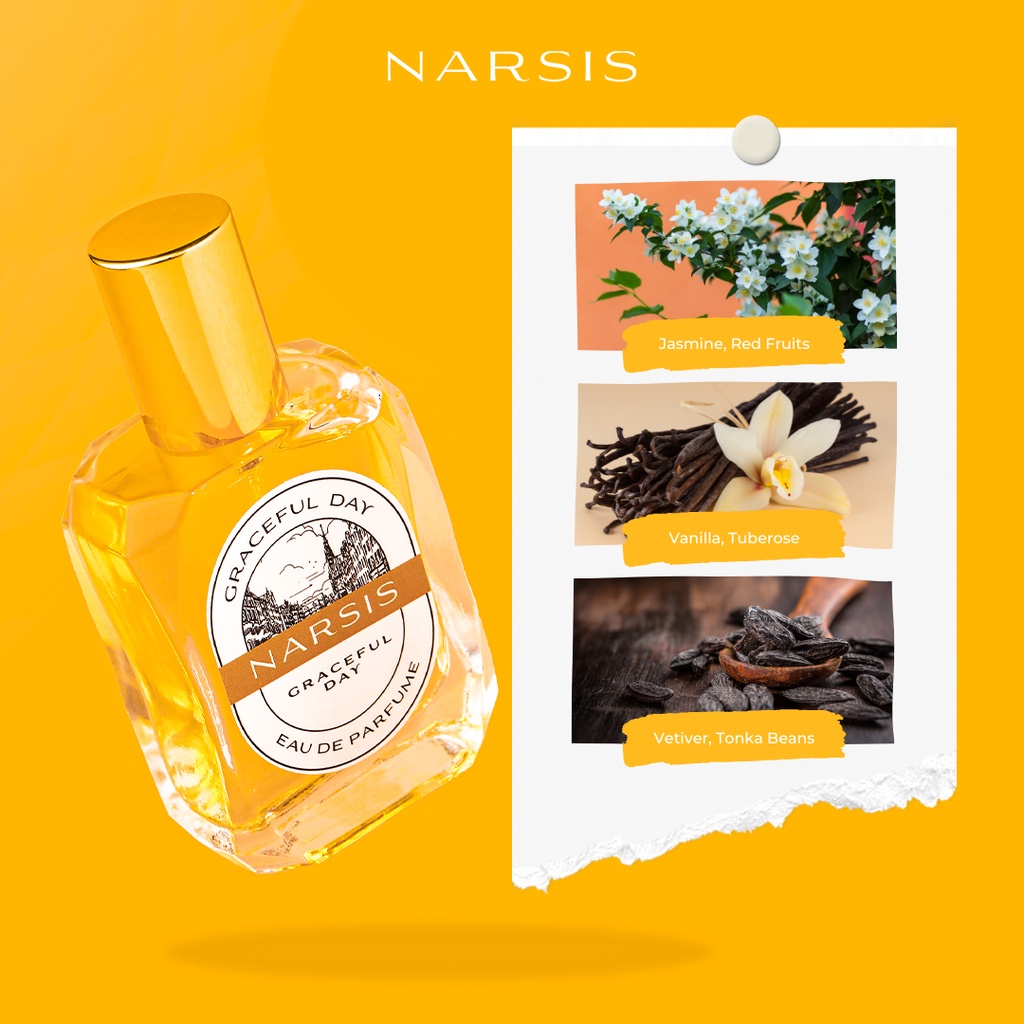 NARSIS Graceful Day termasuk dalam jenis parfum Eau de Perfume (EDP) yang memiliki konsentrasi keharuman tinggi, aromanya lembut, didominasi oleh keharuman jasmine dan vanila yang tahan lama dan tentunya sangat cocok digunakan untuk sehari-hari.