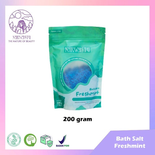 Narwastu Bath Salt relaxing your body 200 gr terdiri 2 varian : 1. Bath Salt jasmine memberikan aroma melati yang menenangkan 2. Bat Salt Fresh Mint memberikan sensasi dingin sebagai aroma mint yang menyegarkan dan menenangkan