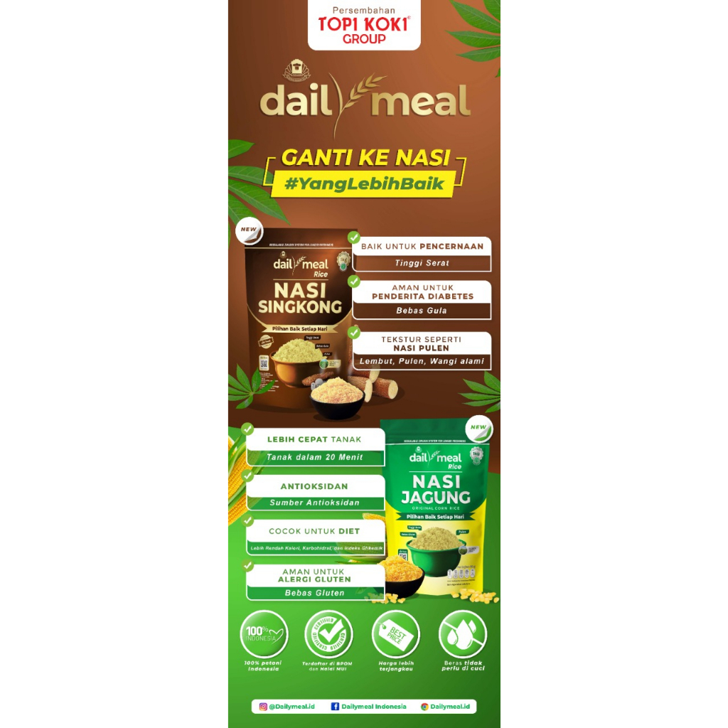 DailyMeal Nasi Singkong Inovasi Beras dari Topi Koki dari Singkong pilihan berkualitas dengan rasa dan tekstur nasi yang pulen dan enak, menjadi alternatif pengganti nasi yang lebih baik. Dengan kandungan serat tinggi, bebas gula dan gluten untuk semangat setiap hari. Manfaat Nasi Singkong: - Tinggi serat (baik untuk pencernaan) - Bebas Gula (aman untuk penderita diabetes) - Lembut, pulen, wangi alami (Tekstur seperti nasi pulen) Manfaat Nasi Jagung: - Tanak dalam 20 menit (lebih cepat tanak) - Sumber antioksidan - Rendah Kalori, rendah karbohidrat dan indeks glikemik - Aman untuk alergi gluten (Gluten Free)