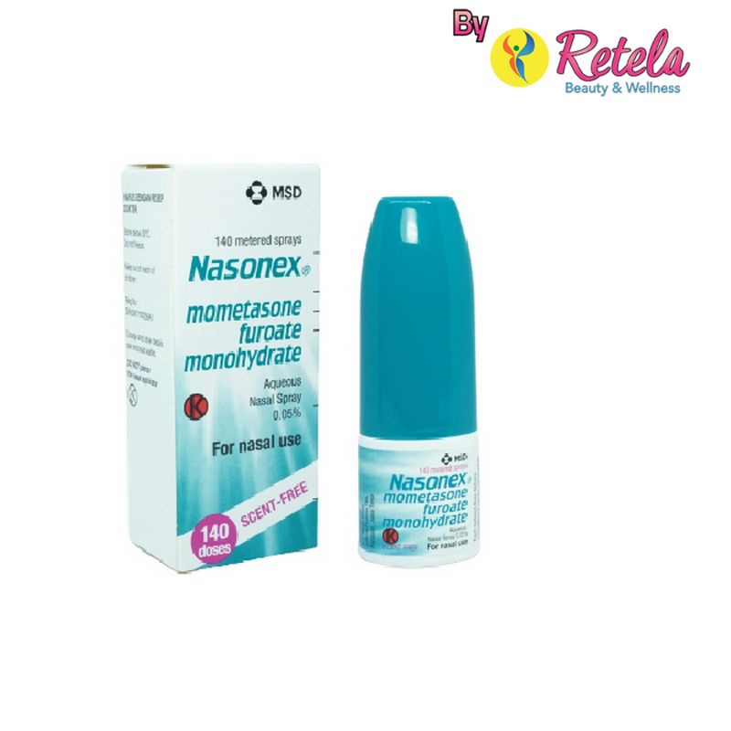 Komposisi: Tiap dosis semprotan mengandung mometasone furoate 50 mcg