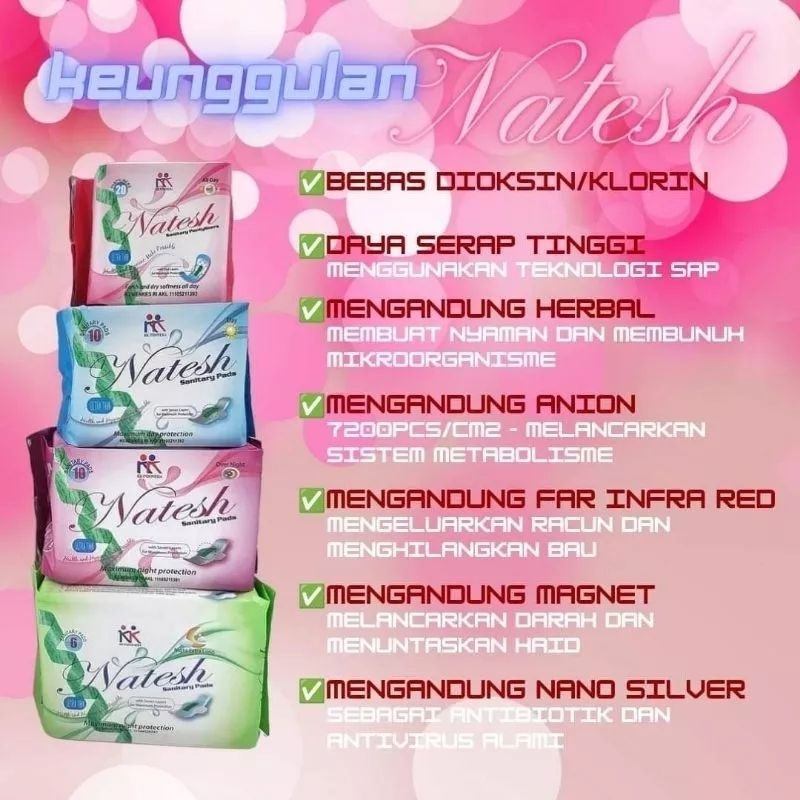 đ° 1 Karton NATESH Natesh Day ( 150 Pack ) Natesh Pantyliner ( 150 Pack ) Natesh Night ( 80 Pack ) Natesh Extra Long ( 108 Pack ) _______________________________________________ đ° MANFAAT PEMBALUT NATESH : â Mencegah keputihan. â Melemahkan jamur, bakteri, virus, dan parasit yang berbahaya bagi organ intim & reproduksi â Menghilangkan bau tdk sedap. â Mencegah dan membantu mengatasi gatal-gatal akibat pembalut yang terlalu lembab. â Melancarkan sirkulasi darah di seputar organ intim&reproduksi. â Memperkecil resiko kanker serviks/mulut rahim, kanker ovarium, uteri, kanker payudara, myoma, endometriosis, kista ovarium, & lainnya. â Meringankan stress dan emosional terutama di saat haid / menjelang menopause. â Menjaga kulit tetap segar dan tidak iritasi saat menggunakan pembalut & pantyliner. â Menenangkan & memudahkan tidur, meredakan nyeri, mengurangi inflamasi, mengurangi bengkak. â Mencegah & membantu meringankan hemoroid/wasir. â Mempercepat pembuangan darah kotor, gumpalan darah pada rahim, serta meringankan sakit pinggang saat haid.