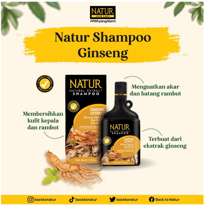 Kandungan Bioaktif dalam Natur Shampoo Gingseng tersebut bekerja secara berkesinambungan dalam perawatan rambut rontok dengan memberikan manfaat deep conditioning pada rambut dan menstimulasi peredaran darah di kulit kepala agar rambut tetap sehat dan kuat. Manfaat: - Mengatasi kerontokan rambut. - Membantu merawat kekuatan akar rambut. - Menjadikan rambut bersih, tetap sehat & kuat.