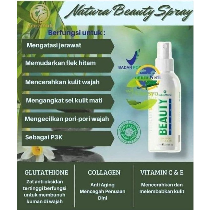 Natura Beauty Spray terbuat dari.... 👉 Gluthathion "Manfaatnya untuk anti oksigen dan membunuh kuman" 👉 Collagen "Manfaatnya menghilangkan jerawat, bekasnya dan mencerahkan wajah" 👉 Lidah Buaya "Manfaatnya menghilangkan flek Hitam" 👉 Bengkoang "Manfaatnya menutrisi kulit kering dan kusam" 👉 Akar Manis "Mengurangi minyak pada wajah" 👉 Kacang Polong "Manfaatnya untuk P3K"Dll.