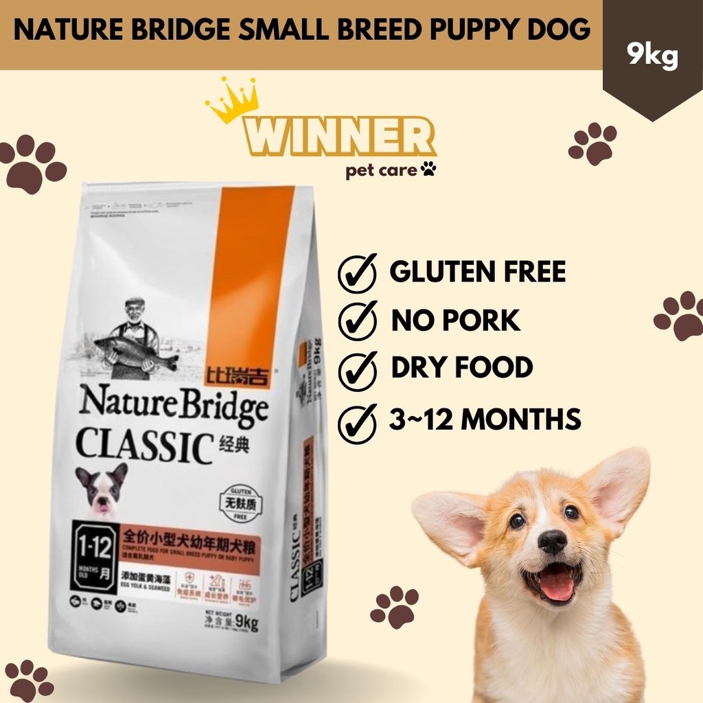 Nature Bridge Small Breed Puppy Dog Food tinggi protein hewani (gluten free), mengandung bahan herbal tanpa pengawet, pewarna, penyedap rasa, dan hormon pemicu pertumbuhan. Bebas babi.
