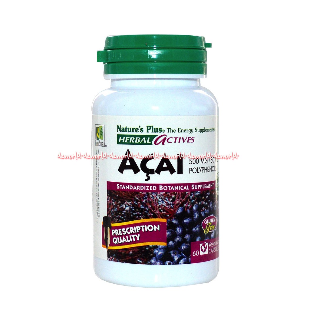 Nature's Plus Acai [60 Capsuls] adalah suplemen kesehatan yang mengandung Asam amino, Karbohidrat, Asam lemak (Oleic acid, Palmitic acid & Linoleic acid ), Vitamin, mineral, tinggi serat , Beta Sitosterol, & Polyphenol yang dapat membantu menurunkan berat badan dan membangun otot, serta dapat sebagai antioksidan yang kuat termasuk untuk anti-aging. Suplemen kesehatan ini juga berguna untuk detoksifikasi, pembersih usus, mengurangi gas & kembung, untuk kesehatan kulit, jantung, mata, pembuluh darah, sistem saraf dll, serta memberikan energi dan meningkatkan imunitas.
