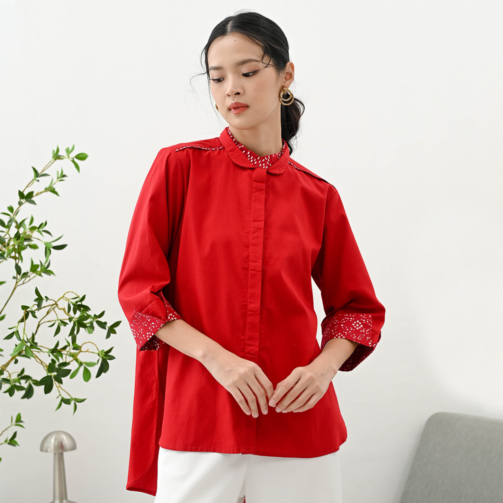 Detail Produk : - Blouse Polos Kombinasi Batik Cap - Warna Merah dan Hijau - Kerah Bulat - Unlined - Regular Fit - Panjang Tangan 7/8