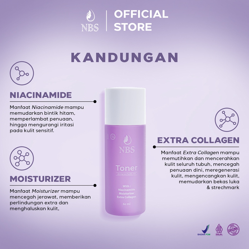 NBS Toner Extra Glow (60ml) Penyegar kulit dengan kandungan Niacinamide, Moisturizer, dan Extra Collagen yang dapat membersihkan wajah sehingga wajah akan terhindar dari kekusaman, kotoran, hingga komedo. Dilengkapi dengan formula double whitening yang akan membuat kulit wajah glowing.