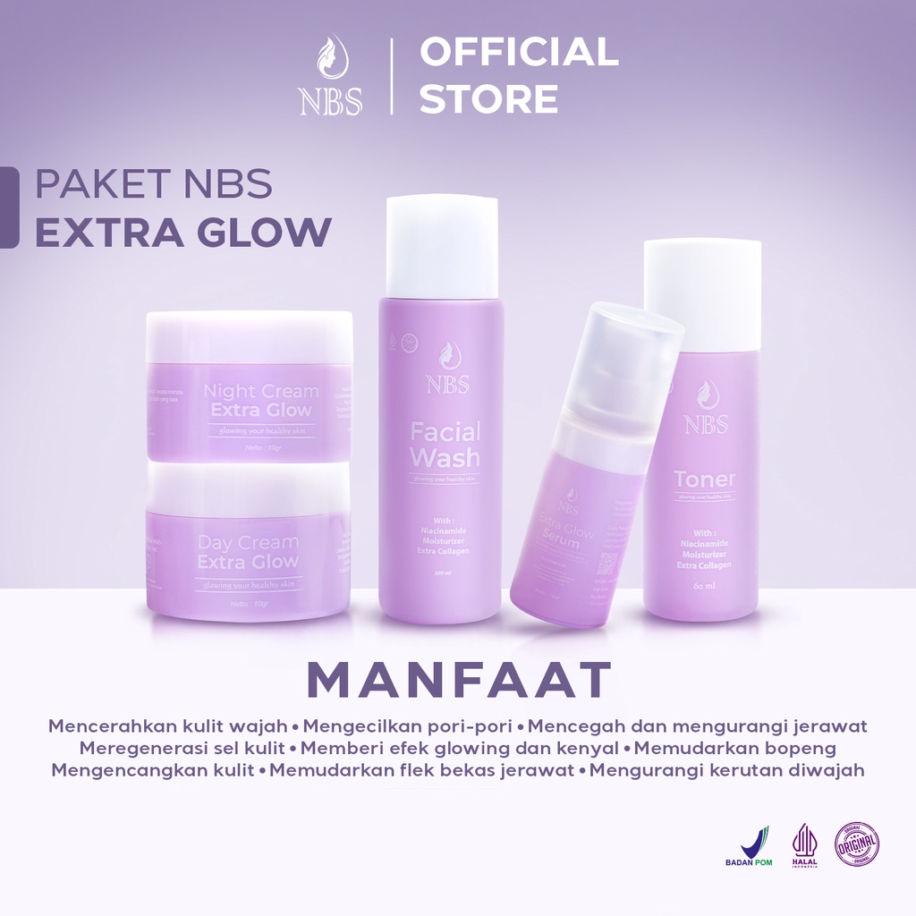 Manfaat NBS Skincare Extra Glow - Mencerahkan kulit wajah - Mengecilkan pori-pori - Mencegah dan mengurangi jerawat - Meregenerasi sel kulit - Memberi efek glowing dan kenyal - Memudarkan bopeng - Mengencangkan kulit - Memudarkan flek bekas jerawat - Mengurangi kerutan di wajah