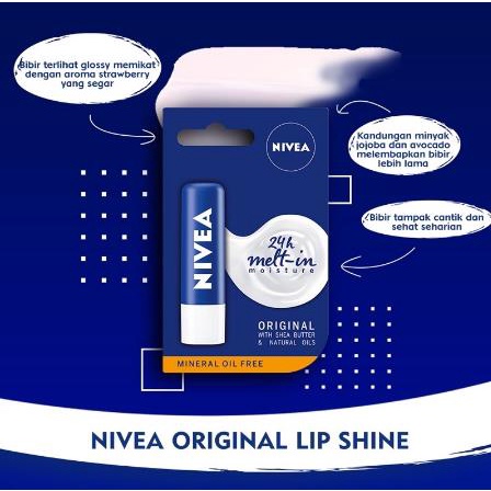 Nivea Lip Original Care Lip Balm, Lip Balm dengan Shea Butter dan Panthenol yang dapat memberikan perawatan 12 jam untuk melembabkan bibir serta menjaganya agar selalu halus, lembut dan tidak kering.