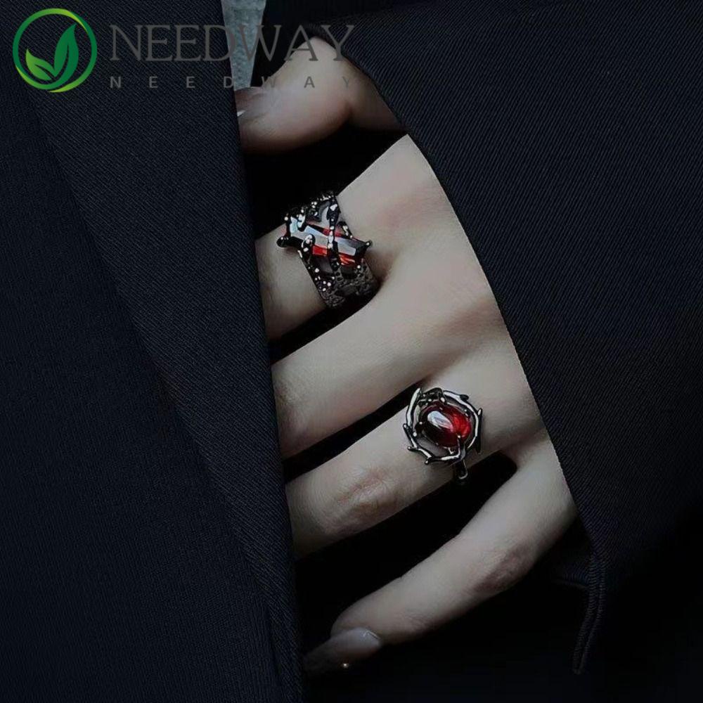 Needway Cincin Geometris Kepribadian Hip Hop Terbuka Cincin Aksesoris Perhiasan Hadiah Hari Valentine Gaya Korea Perhiasan Permata Merah Perhiasan