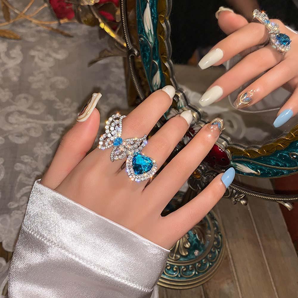 Cinta Cincin Terbuka Cincin Jari Paduan Kupu-kupu Zirkon Wanita Biru Gaya Korea Geometris Dapat Disesuaikan Sederhana Retro Trendi Kepribadian