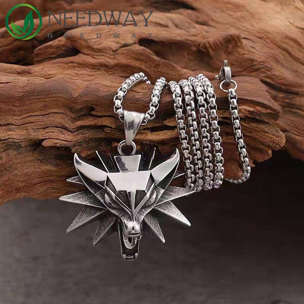 Needway Pria Kalung Pesona Keren Sederhana Klavikula Rantai Serigala Kepala Tergantung Rantai Stainless Steel Hewan Niche Desain Permainan Peripheral Perhiasan Sweater Rantai