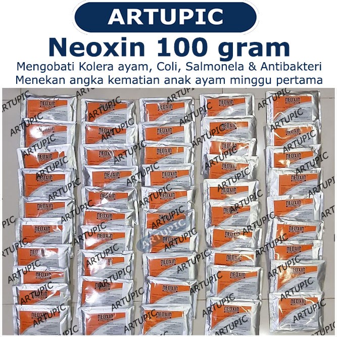 HARGA = Beli 1 harga 24.200 Beli 2 harga 24.000 .=================== ARTUPIC adalah Distributor resmi PT. Mensana. Dan team dokter hewan PT.Mensana rutin merawat kesehatan ayam petelur di peternakan milik Artupic lokasi Bogor dengan luas 5 hektar. Semua obat dari kami dijamin ASLI dan TEPAT GUNA karena pengalaman kami di lapangan. .=================== NEOXIN 100 gram Kombinasi antibakter water soluble