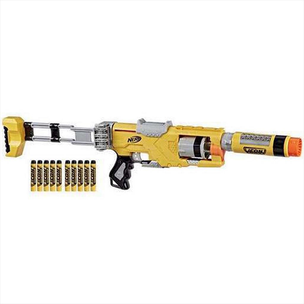 - Includes: blaster, 10 darts - The Icon Series brings back the fan-favorite Nerf N-Strike Spectre Rev-5 blaster, featuring a special Icon Series colors - The blaster comes with attachable barrel extension and folding stock to create 6 different blaster looksx - Includes 10 Official Nerf Elite darts with special Icon Series deco - Barrel swings open when you press the button for easy loading and holds 5 darts. Blaster fires 5 darts in a row: pull the slide back to prime, and press the trigger to fire.