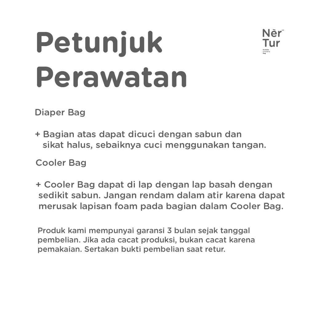 Bahan: Luar: Cordura Canvas (Ringan, Kuat, cocok untuk Daily Diaper Bag) Dalam: Inner Lining warna terang (mempermudah dalam mencari barang) Cooler Bag: Thermal Fabric dengan sambungan Heat Seal anti bocor