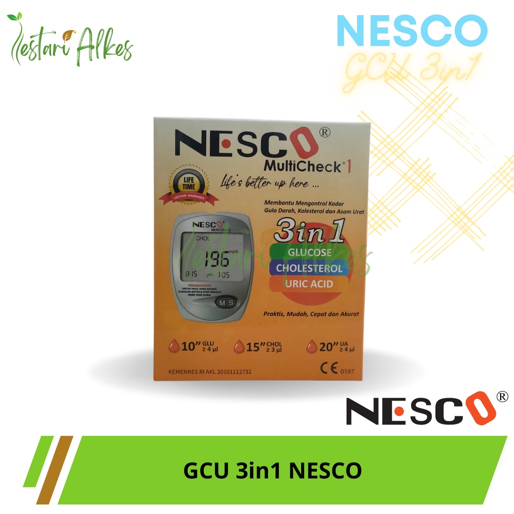 Nesco multicheck merupakan alat yang bisa digunakan untuk mengecek glukosa darah, kolesterol , asam urat. Alat ini mudah dibawa pergi kemana saja. Dengan sistem monitoring multi-fungsi dengan tampilan LCD yang besar membuat Nesco multicheck nyaman dilihat, hasil waktu meteran yang cukup singkat dan akurat membuat kita hemat waktu serta biaya. Meteran mengidentifikasi strip secara otomatis Hasil hanya 10 detik (glukosa) / 20 detik (asam urat) / 150 detik (kolesterol) Tampilan LCD besar (35 x 45 mm) Dimensi meter H x W x D (mm) : 88 x 64 x 22