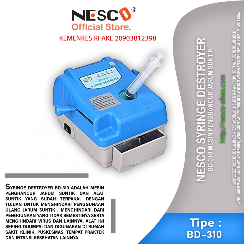 Syringe Destroyer BD-310 adalah mesin Penghancur jarum suntik dan alat suntik yang sudah terpakai, dengan tujuan untuk menghindari penggunaan ulang jarum suntik , menghindari dari penggunaan yang tidak semestinya serta menghindari virus dan lainnya. Alat ini sering dijumpai dan digunakan di rumah sakit, klinik, puskesmas, tempat praktek dan intansi kesehatan lainnya.
