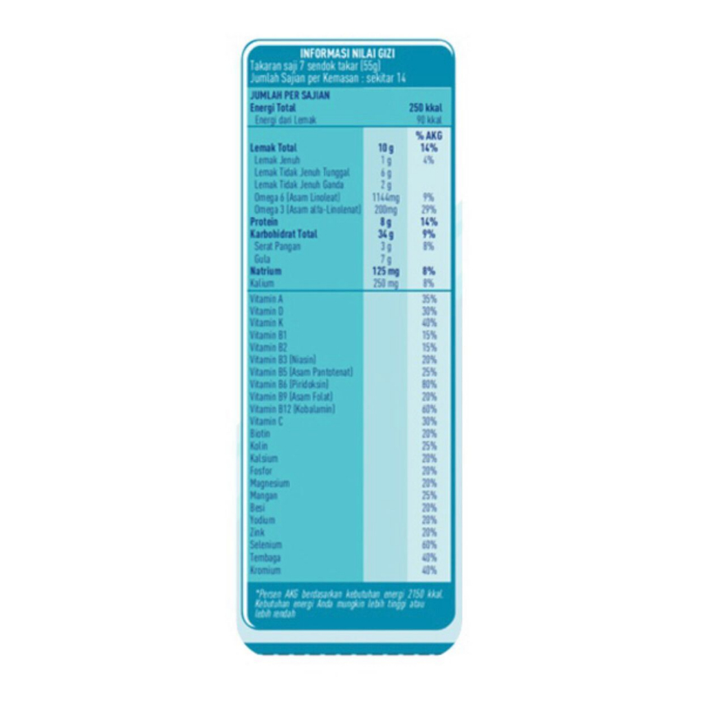 Mengandung protein Whey, sumber serat pangan, tinggi Vitamin E, B6, dan B12 untuk membantu memenuhi kebutuhan nutrisi harian agar tetap aktif sepanjang usia.
