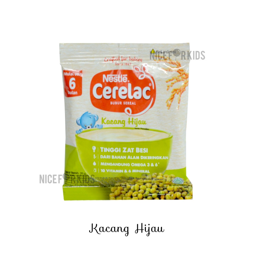 Nestle Cerealac sudah terkenal dengan makanan pendamping ASI seperti yang disarankan oleh dokter atau tenaga kesehatan. Cerelac dipercaya sebagai MP-ASI instan bergizi lengkap untuk perutnya yang kecil. Mengandung zat besi, zink, vitamin A dan vitamin C untuk membantu memenuhi kebutuhan nutrisi hariannya. Dikemas per renceng berisi 8 sachet @20 gr perbungkusnya. Sangat cocok untuk bekal perjalanan (kemasan sekali takar).