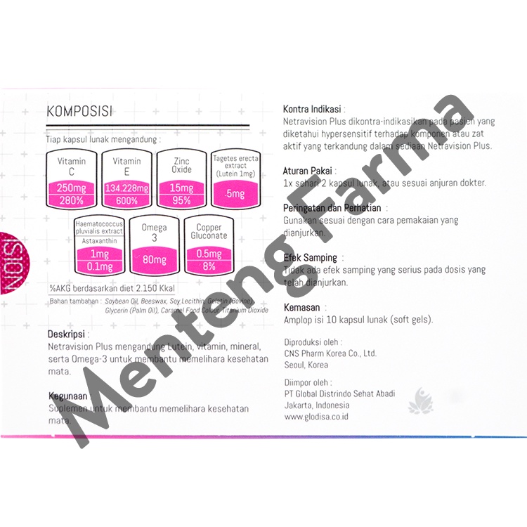 Kontra indikasi : Netravision Plus dikontra-indikasikan pada pasien yang diketahui hypersensitif terhadap komponen atau zat aktif yang terkandung dalam sediaan Netravision Plus.