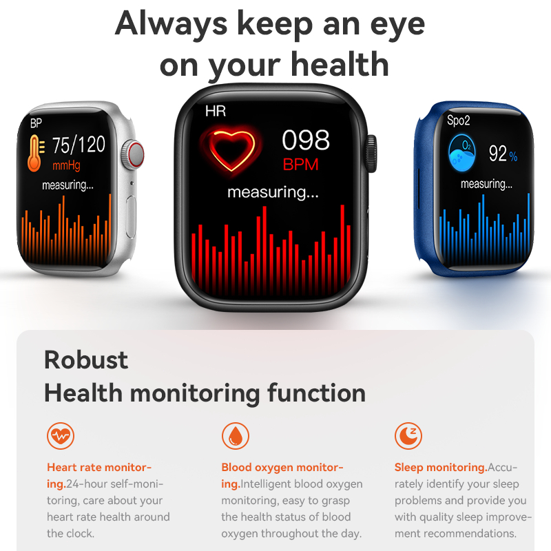Features: 1. Keep an eye on your health: Heart rate, blood pressure, blood oxygen, activity rings, breath training, sleep tracker.