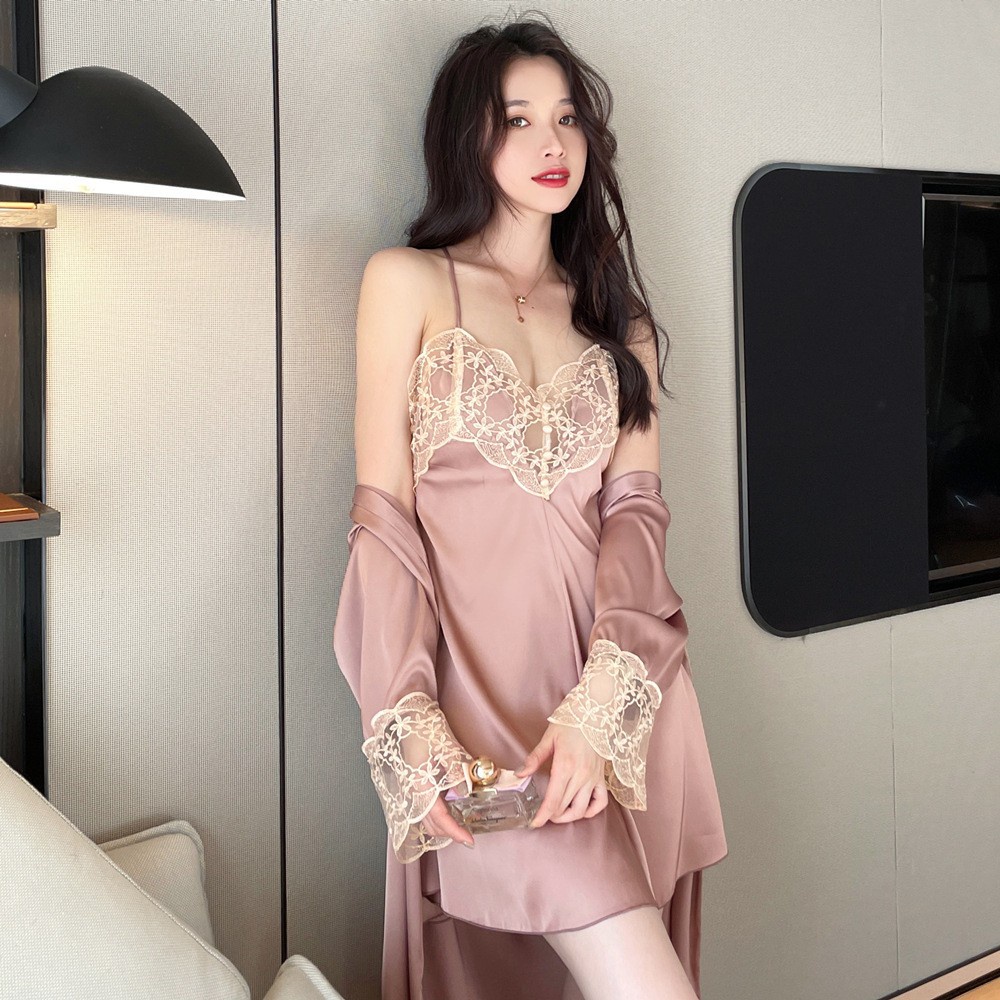 Pakaian Wanita > Pakaian Tidur & Piyama > Daster > 【New】FRS Home Renda Baju Tidur Wanita 2022 Baru Musim Semi dan Musim Gugur Es Sutra Piyama Dua Poton