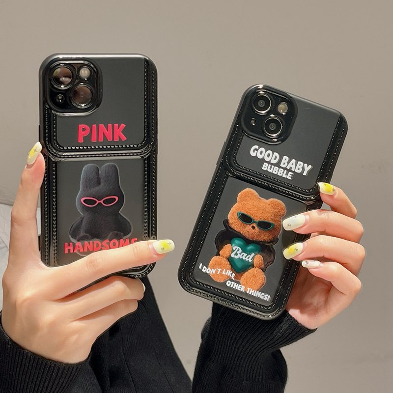 Handphone & Aksesoris > Casing & Skin > Casing & Skin Handphone > New Imitation Cream Bag TPU Case for iPhone 12 13 14 Pro Max Black Soft Silicone Case for Women Girl's Fashion Cool Black sunglasses Rabbit Bear Couple