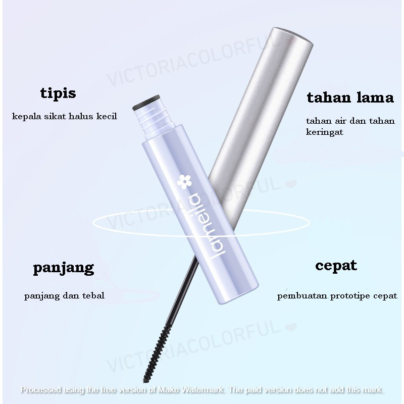 Maskara tahan air dan keriting panjang warna hitam. Dapat membuat bulu mata terlihat lebih panjang atau lentik, dengan formulasi tahan air membuat maskara tidak mudah luntur dan tahan lama. Membuat bulu mata Anda cantik, dengan ukuran sikat yang kecil sangat mudah di aplikasikan ke bulu mata Anda.