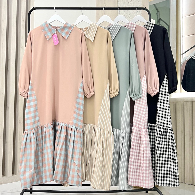 Detail Midi Dress Kombinasi Kotak Bahan Adem Dress Korea Terbaru Dress Kotak