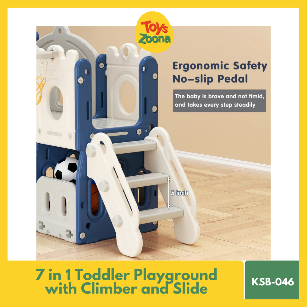 This kids' slide is made of certified high-quality HDPE material, ensuring complete safety for your child. The 7-in-1 slide playset structure includes a step ladder, a castle tower-shaped pathway, a smooth slide, a basketball hoop, and an organizer compartment.