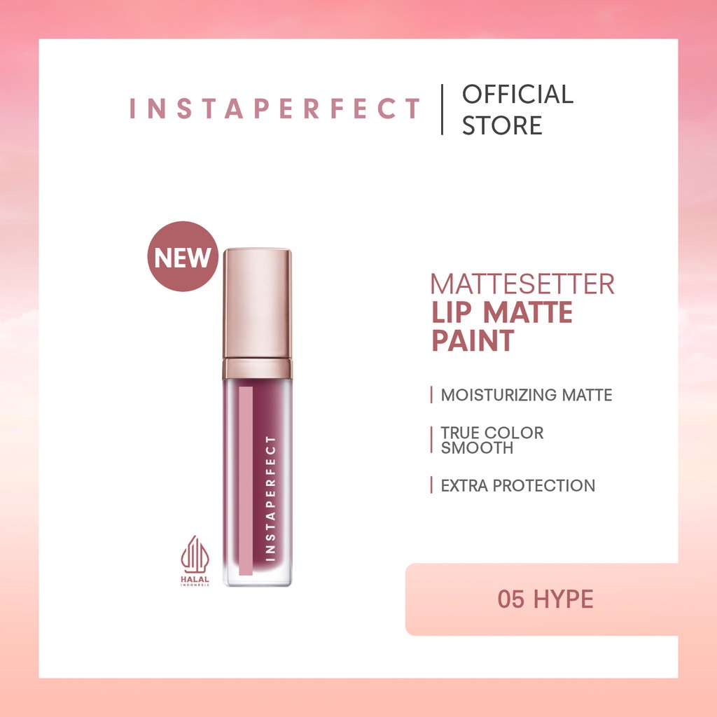 No need to find the other comfortable lip cream, Instaperfect Mattesetter Lip Matte Paint yang hadir dengan kemasan baru yang lebih cantik. Moist lip cream halal yang hadir dengan 9 warna dan formula yang nyaman untuk digunakan sehari-hari. Memiliki tekstur creamy yang intens saat dioleskan agar dapat memberikan True Color Coverage yang dapat menutupi bibir pucat atau bibir gelap serta memberikan non-crack finish yang bertahan lama pada bibir. Mengandung Natural Oils yang memberi hasil Moisturizing Matte dan dapat menutrisi bibir dengan mengikat molekul air di kulit bibir sehingga cocok diaplikasikan pada bibir yang kering. Diformulasikan dengan Ectoin dan Antioxidant sebagai Urban Skin Veil yang dapat memberikan perlindungan ekstra terhadap efek buruk UV-A, UV-B, dan hamrful urban environment* dan menjadi protective veil untuk memperkuat skin barrier dalam penggunaan jangka panjang. Cocok untuk semua jenis kulit, dermatologically tested, non acnegenic, non comedogenic, dan hypoallergenic.*debu dan kotoran, berdasarkan uji ex vivoKeunggulan:- Moisturizing Matte Finish- True Color Coverage- Non-Crack Finish- Urban Skin Veil formulated with Ectoin, Antioxidant, and Natural OilsTerdiri dari 9 warna:01 Glee - Coral Pink02 Dear - Mauve Pink 03 Chic - Mauvish Brown04 Vibe - Dark Red05 Hype - Pinkish Purple 06 Flair - Orangeish Brown07 Dazzle - Nude Peach08 Edge - Nude Brownish09 Icon - Nude PinkCara penggunaan:1. Gunakan pelembab bibir bila dibutuhkan, biarkan pelembab kering sebelum penggunaan lip product2. Aplikasikan lip product pada seluruh bagian bibir hingga merata dan tunggu hingga kering3. Tambahkan intensitas warna sesuai dengan yang kamu inginkan