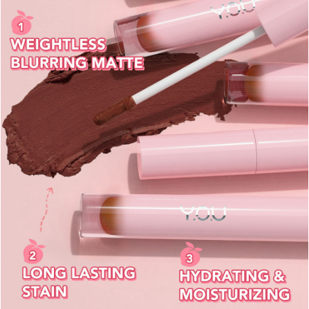 🍑 Weightless Blurring Matte Tekstur lembut seperti kapas yang terasa ringan dengan Ekstrak Cocoa Butter, memberikan polesan lembut, efek blurring matte dan tidak lengket