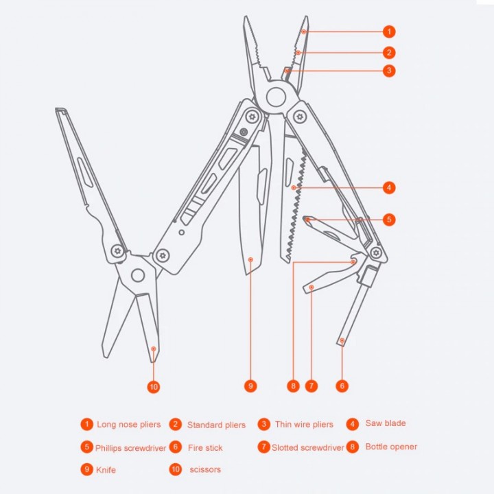 10 fungsi yang terdapat pada alat ini antara lain: - Needle-Nose Pliers - Standard Pliers - Wire Cutter - Scissors - Folding Knife - Wood Saw - Screwdriver - Phillips Screwdriver - Bottle Opener - Fire Stick