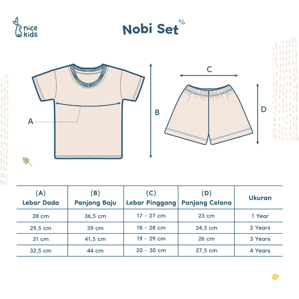 Available sizes: Atasan = 1 year = Chest 28cm, Length 36.5cm 2 years = Chest 29.5cm, Length 39cm 3 years = Chest 31cm, Length 41.5cm 4 years = Chest 32.5cm, Length 44cm Bawahan = 1 Year = panjang celana 23cm , lebar pinggang 17 cm 2 Years= panjang celana 24.5cm , lebar pinggang 18 cm 3 Years = panjang celana 26cm , lebar pinggang 19 cm 4 Years = panjang celana 27.5cmm , lebar pinggang 20 cm