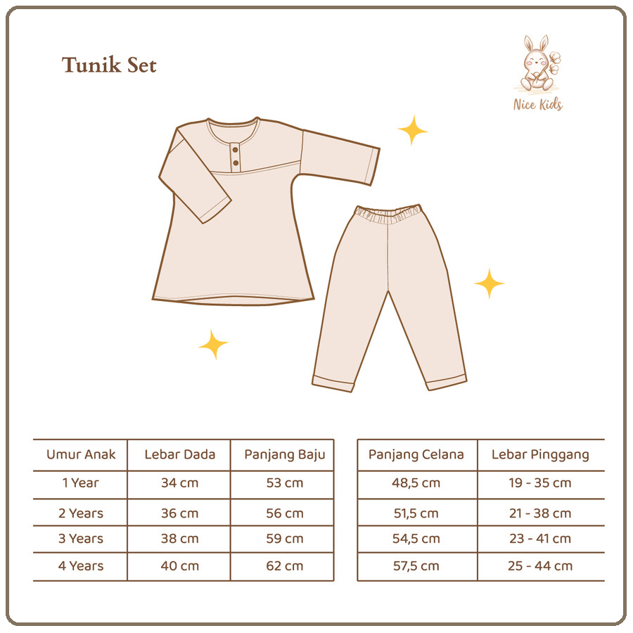 Available sizes: Atasan Tunik 1 y : Lebar Dada 34 cm, Panjang Baju 53 cm 2 y : Lebar Dada 36 cm, Panjang Baju 56 cm 3 y : Lebar Dada 38 cm, Panjang Baju 59 cm 4 y : Lebar Dada 40 cm, Panjang Baju 62 cm