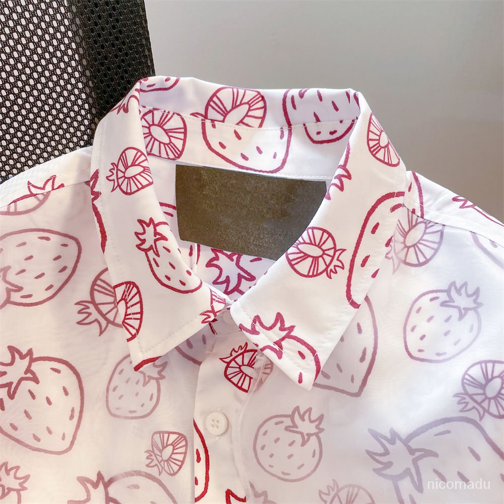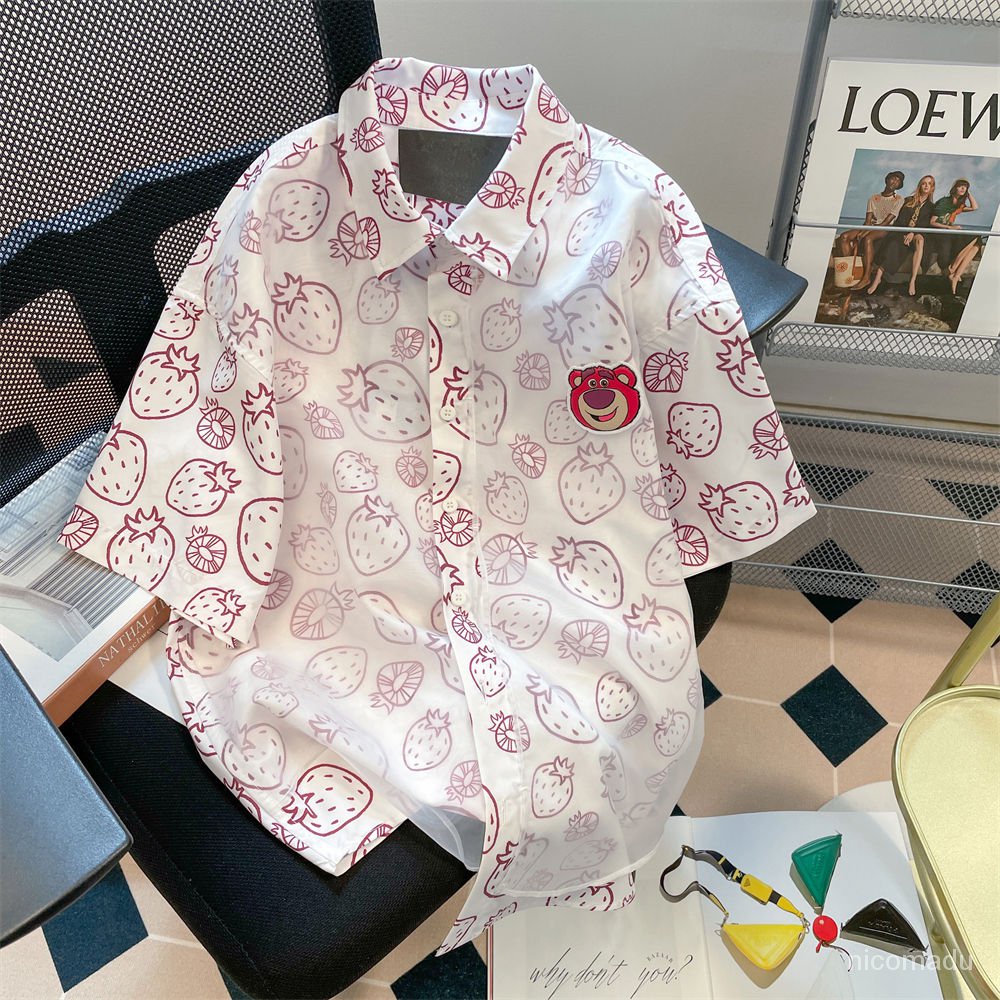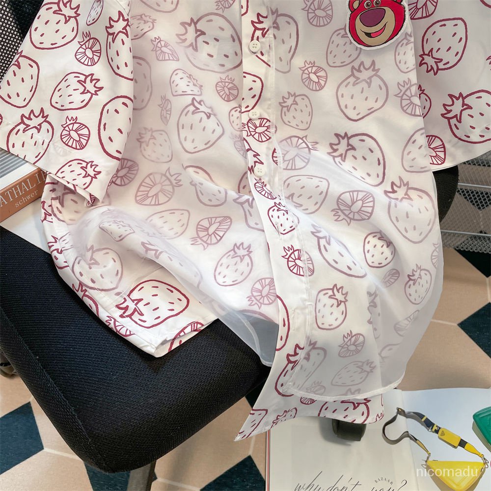 Detail Nico##kemeja putih wanita lengan pendek/Kemeja lengan pendek wanita fullprint strawberry bear