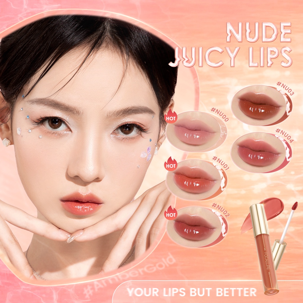 FOCALLURE #AmberGold Jelly Lip Gloss Juicy Dewy Essence Lip Tint Lip Care 3 Textures High Pigmented Watery Non-sticky Plumpy Long Wear Lipstick