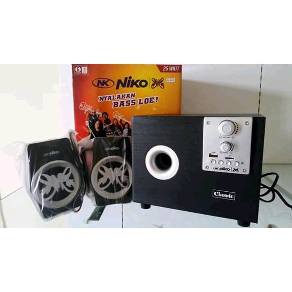 B. CLASSIC Niko Slank Classic merupakan speaker aktif dengan style simple namun tetap modern dan tentu saja dilengkapi dengan Bomb bass Technology Tipe Speaker : Active Satellite Speaker : Speaker 2.1 Konektivitas : Bluetooth V3 dan Aux Cable Media Player : USB & SD Card Radio : Yes Remote : No Pengaturan tombol : Volume dan Bass Speaker Size : 3 Inch Daya/R.M.S : 25 W Respon Frekuensi : 20 Hz - 20KHz Dimensi Produk : 210 x 160 x 175 mm Kelengkapan : 1 pcs Subwoofer + 2 pcs satelite Speaker