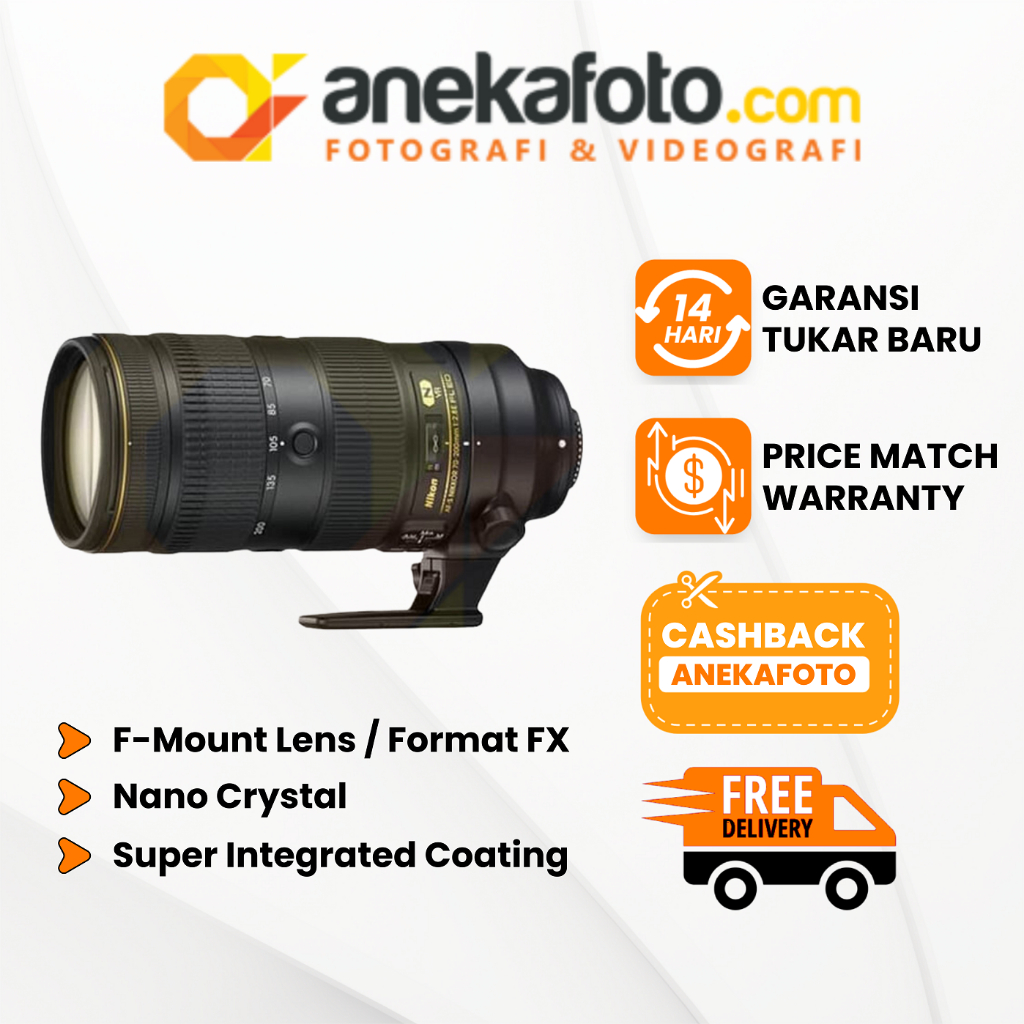 Nikon AF-S 70-200mm f/2.8E FL ED VR Lensa Kamera merupakan lensa dengan rentang serbaguna panjang fokal yang lebih panjang dari normal, AF-S NIKKOR 70-200mm f / 2.8E FL ED VR dari Nikon adalah potret untuk zoom telefoto menawarkan aperture maksimum konstan f / 2.8 cerah, kontrol penanganan intuitif, dan konstruksi optik yang canggih. Tata letak yang direvisi ini sekarang mencakup enam elemen dispersi ekstra-rendah, serta satu elemen fluorit dan satu elemen indeks bias tinggi, untuk mengurangi penyimpangan kromatik dan warna fringing untuk meningkatkan kejelasan dan ketajaman. Nano Crystal dan Super Integrated Coatings lebih menguntungkan kualitas gambar dengan mengurangi flare lensa untuk meningkatkan kontras dan akurasi warna dan pelapisan fluor di bagian depan dan elemen belakang melindungi terhadap debu, kelembaban, dan noda.