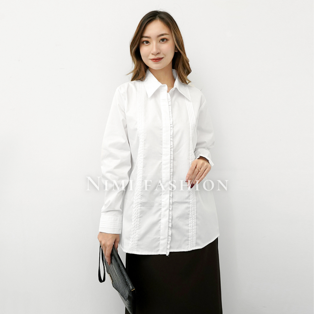 Detail NIMI - Kemeja Putih Formal Wanita Lengan Panjang Bordir Kancing Tutup Seragam Kerja Putih