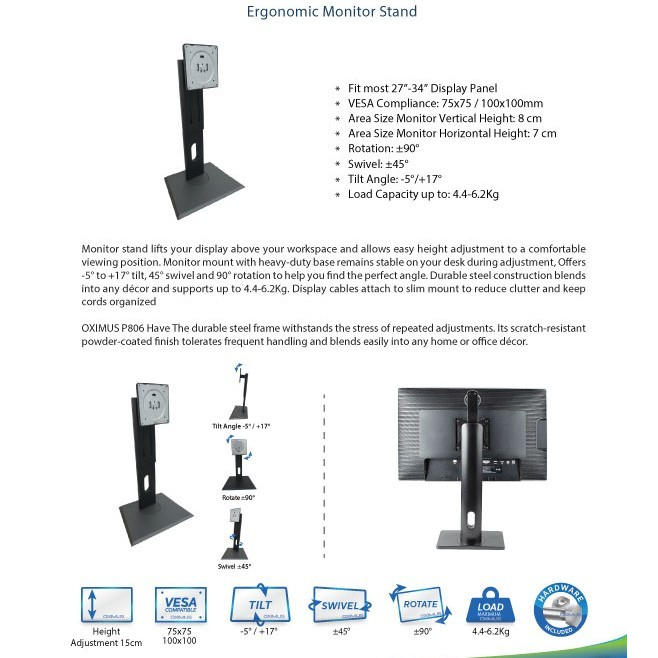 Deskripsi - Vesa Mounting 100x100 - Adjustment Height - Maximai Inch 17-27inch - Max Load <5kg - Material Logam + ABS - Fungsi: Tilt/Pivot/Elevasi/putar - Warna Hitam - Sudut Rotasi: 0°-90°