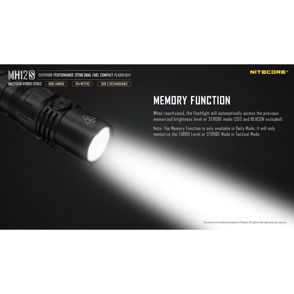 NITECORE MH12S adalah senter dengan bentuk tactical sehingga mudah untuk digunakan dan ditambah dengan aksesoris lainnya. Bahan body aluminum yang kuat membuat senter ini cocok dibawa berpetualang. Senter ini mampu menghasilkan cahaya 1200 lumens berkat LED Cree SST-40 N4 BC yang digunakan.