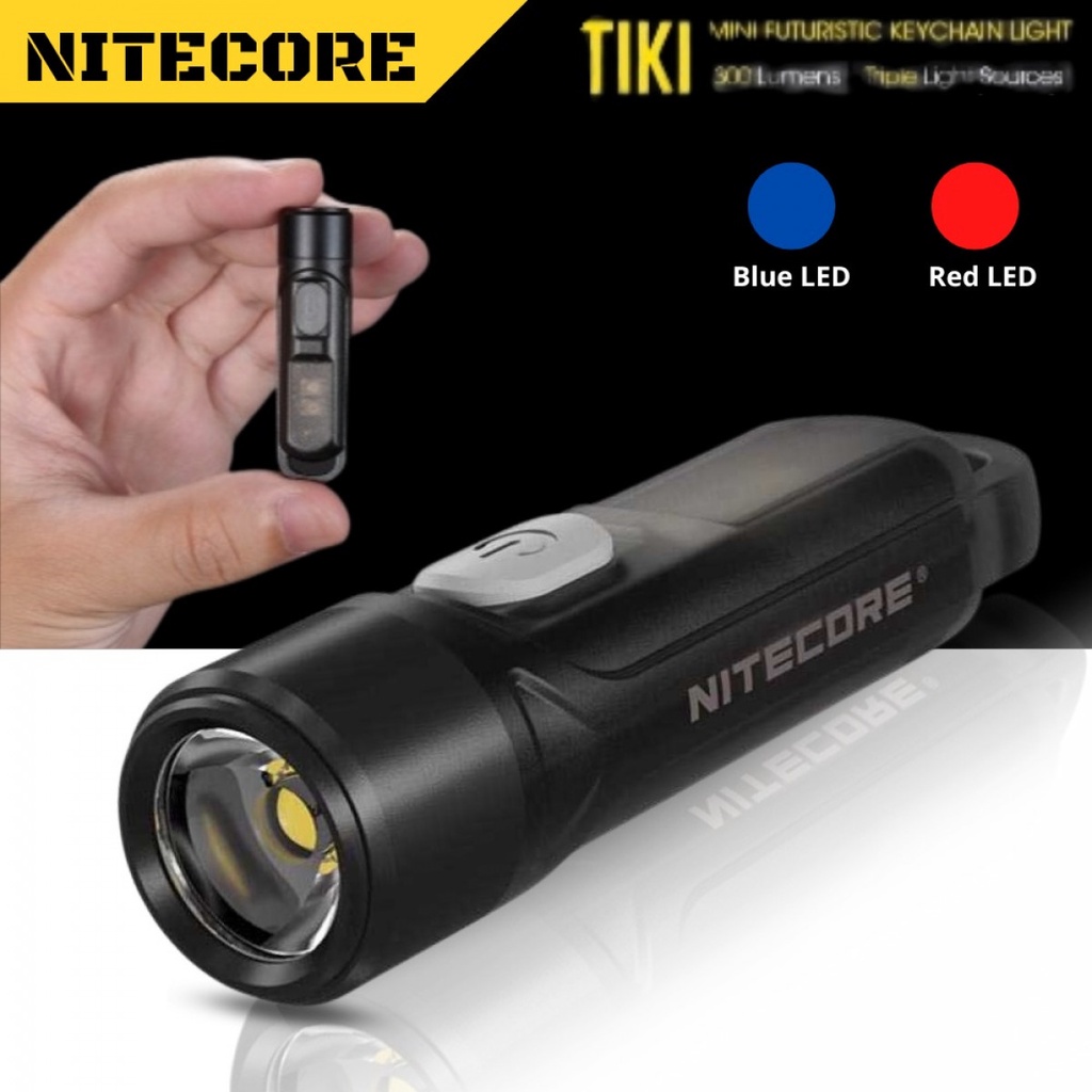 Senter Nitecore TIKI LE ini juga memiliki LED berwarna merah dan biru pada bagian samping senter.