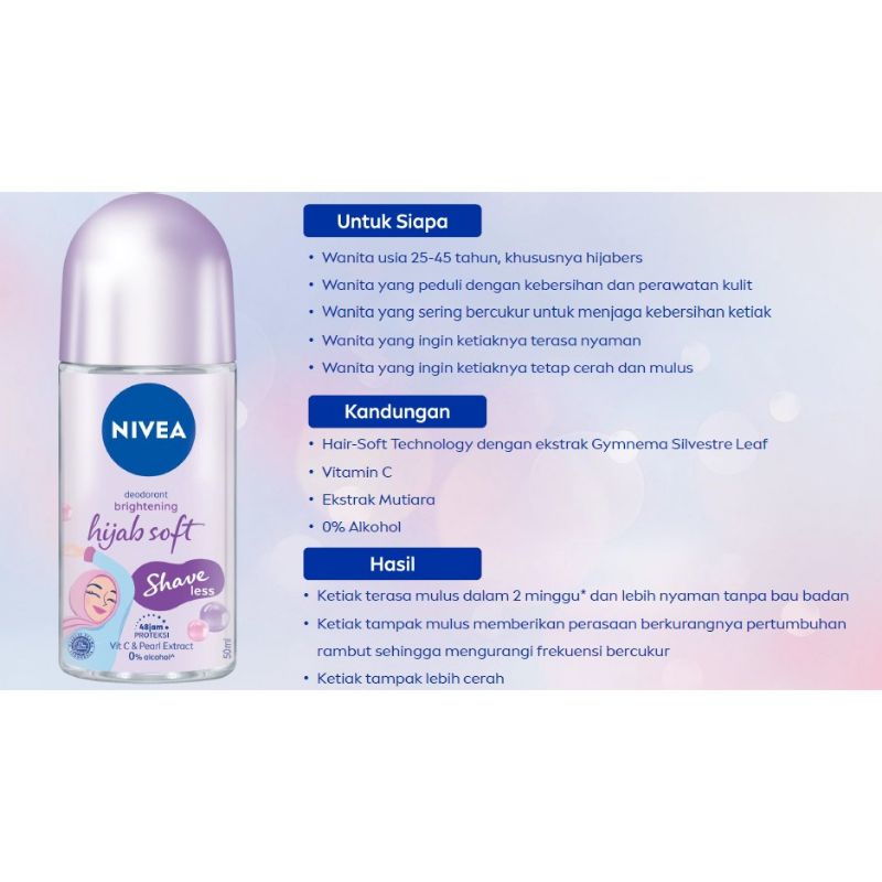 NIVEA Deodorant Brightening Hijab Soft Shave Less 50mlNIVEA Deodorant Brightening Hijab Soft Shave Less 50mlNIVEA Deodorant Brightening Hijab Soft Shave Less 50ml