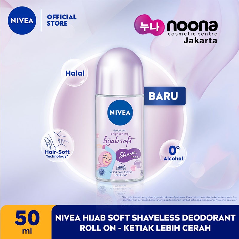 Rasakan kemudahan merawat ketiak lebih cerah dan mulus dalam 2 minggu bersama NIVEA Hijab Soft Shaveless Deodorant Roll On 50ml. Hair-Soft Technology yang diperkaya oleh ekstrak Gymnema Sylvestre Leaf nya, membantu ketiak tampak halus membantu mengurangi pertumbuhan rambut sehingga ketiak lebih mulus dalam 2 minggu dan dapat mengurangi frekuensi bercukur. Formulanya juga membantu kulit ketiak lebih cerah & lembut, serta melindungi ketiak dari keringat berlebih atau bau badan selama 48 jam. Makin hemat dengan kemasan isi 2. Miliki segera!