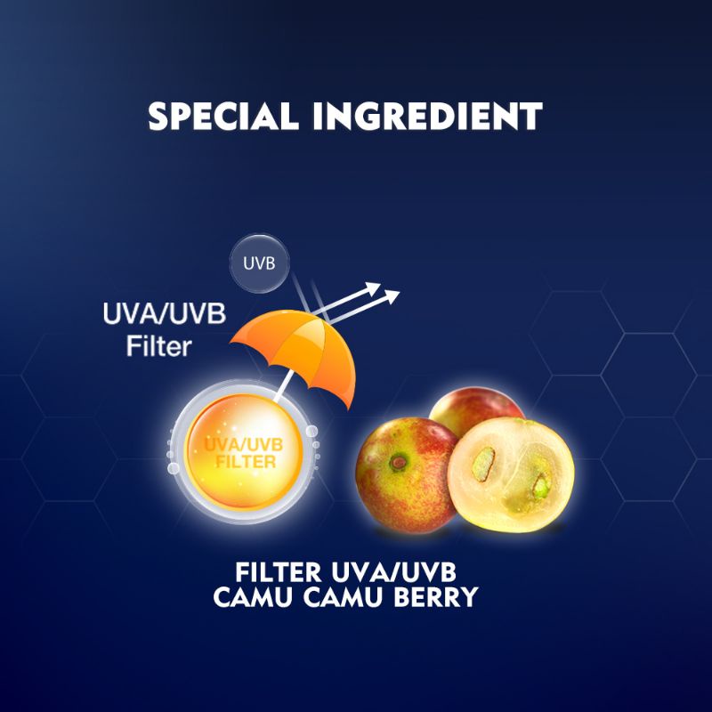 Diperkaya dengan ekstrak Camu-camu Berry yang mengandung Vitamin C 50 kali lebih tinggi dari lemon sehingga dapat merawat kulit dari 10 tanda kulit kusam dan rusak. Dengan SPF 15 membantu melindungi kulit dari efek negatif sinar matahari.