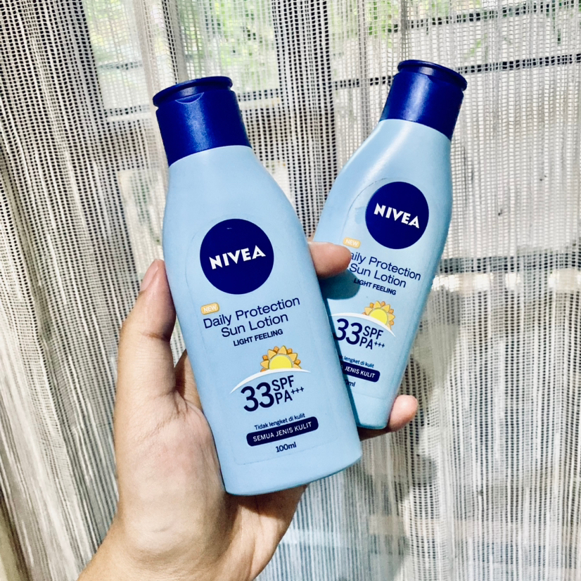 Nivea daily protection sun lotion light feeling SPF 33 PA++ diformulasikan untuk memberikan perlindungan kulit optimal setiap hari dgn: - SPF 33 PA++ melindungi kulit dari efek negatif sinar matahari - Vitamin C sbg antioksidan melawan radikal bebas spt akibat polusi dan paparan sinar ultra violet. - Hydra IQ membantu melembabkan kulit selama 24jam