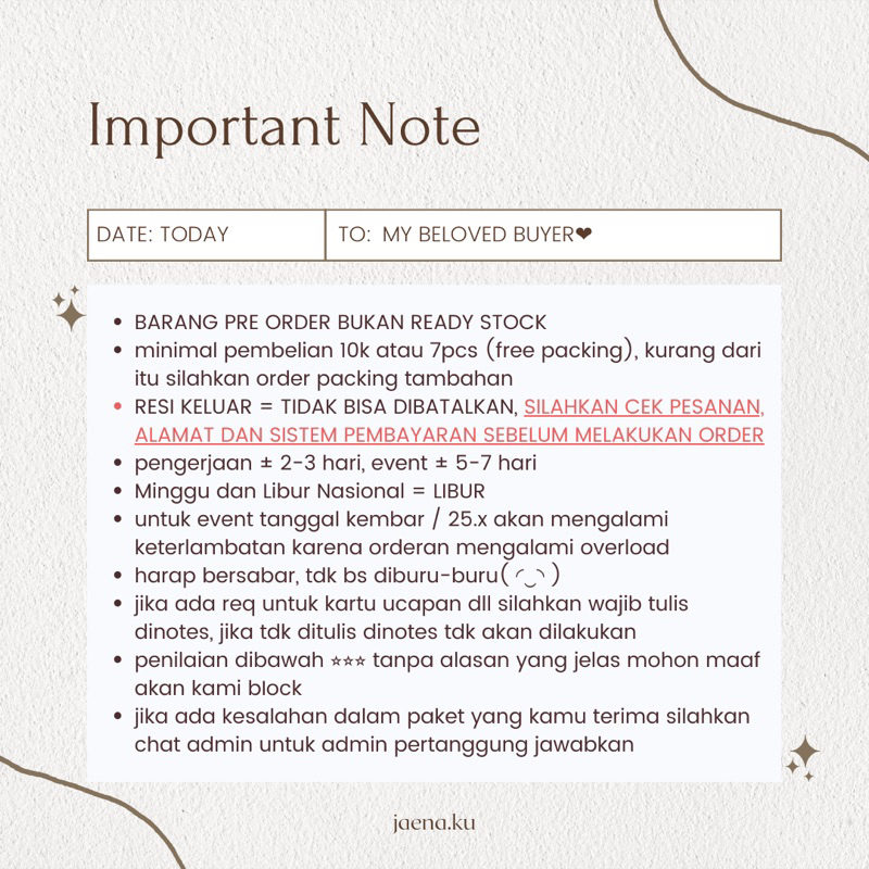 • jika ada req untuk kartu ucapan dll silahkan wajib tulis dinotes, jika tdk ditulis dinotes tdk akan dilakukan